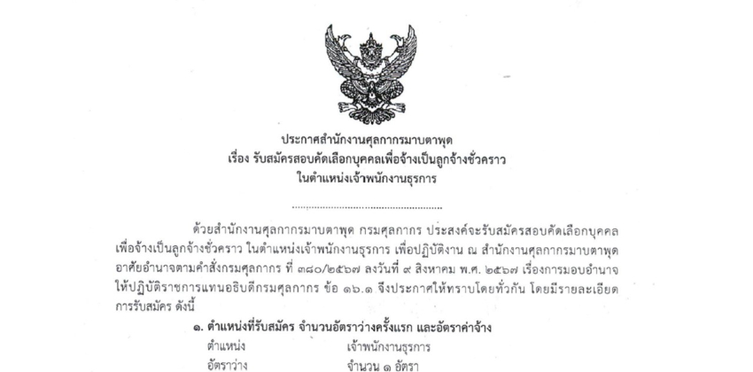 สำนักงานศุลกากรมาบตาพุด กรมศุลกากร ประสงค์จะรับสมัครสอบคัดเลือกบุคคล เพื่อจ้างเป็นลูกจ้างชั่วคราว ในตำแหน่งเจ้าพนักงานธุรการ เพื่อปฏิบัติงาน ณ สำนักงานศุลกากรมาบตาพุด...